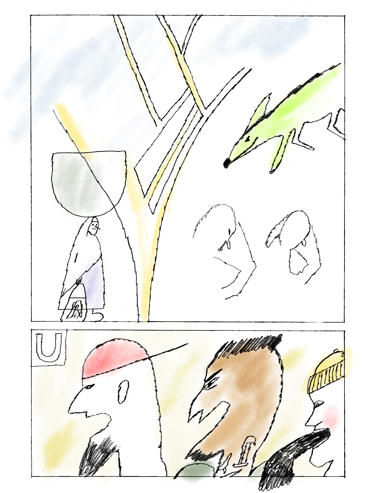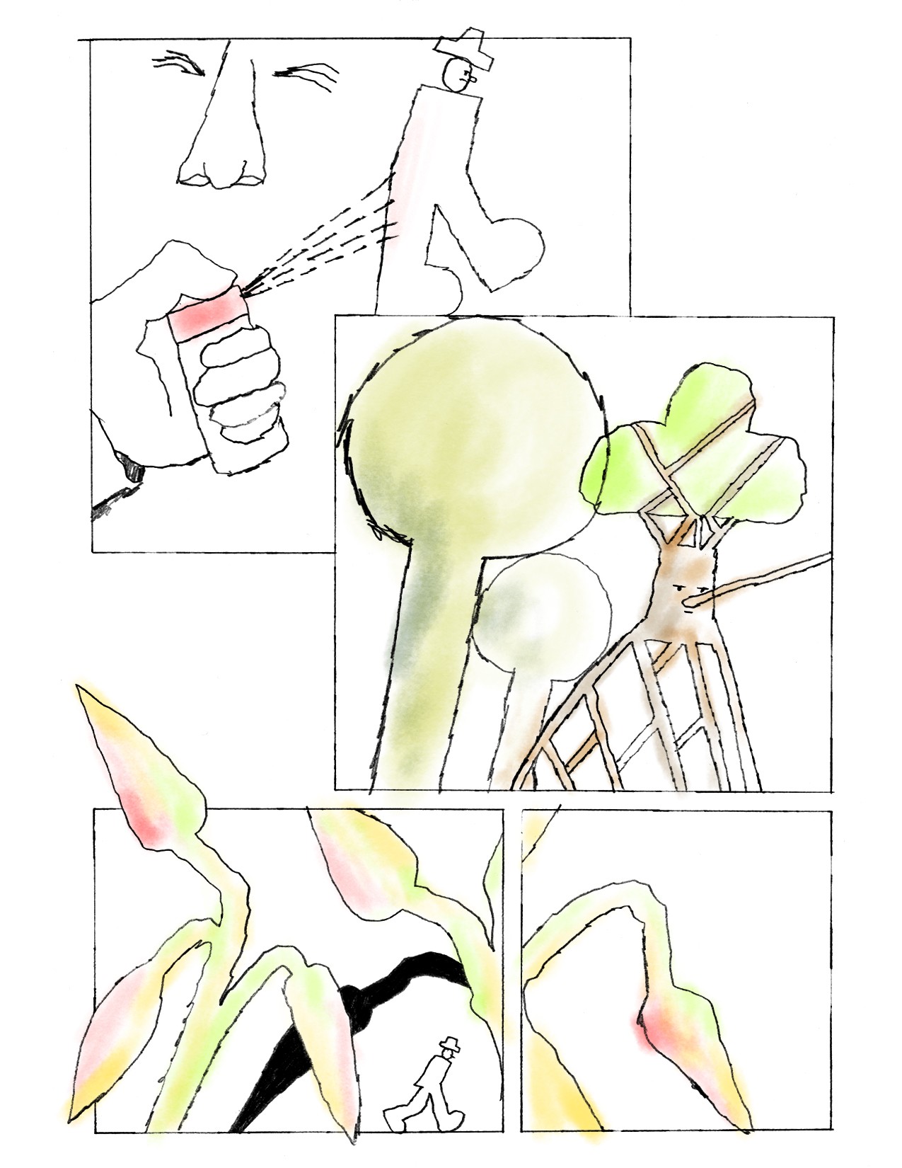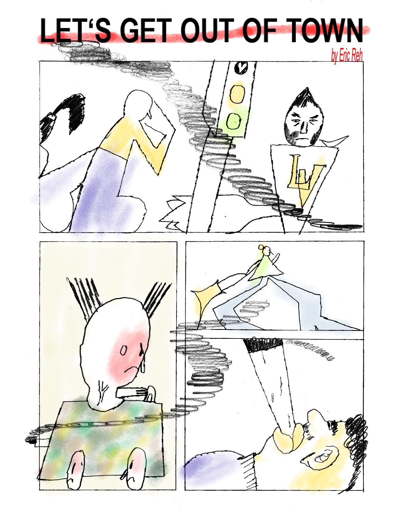 "Let's get out of town", 4-seitiges Comic für das Comic Buch "Preventative Measures" von Kiki & Bouba Gallery (US), 2022