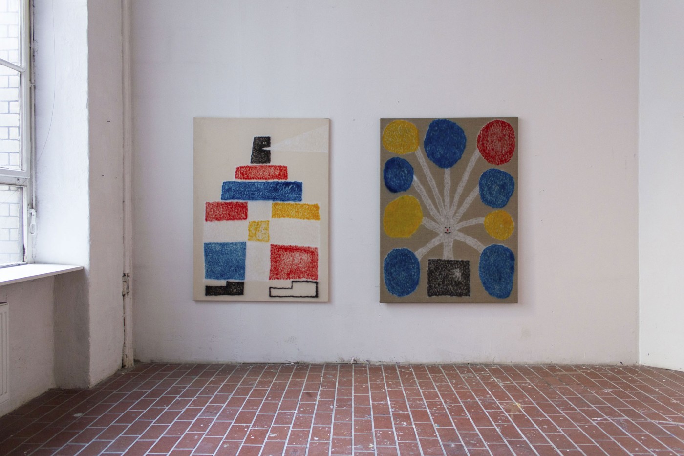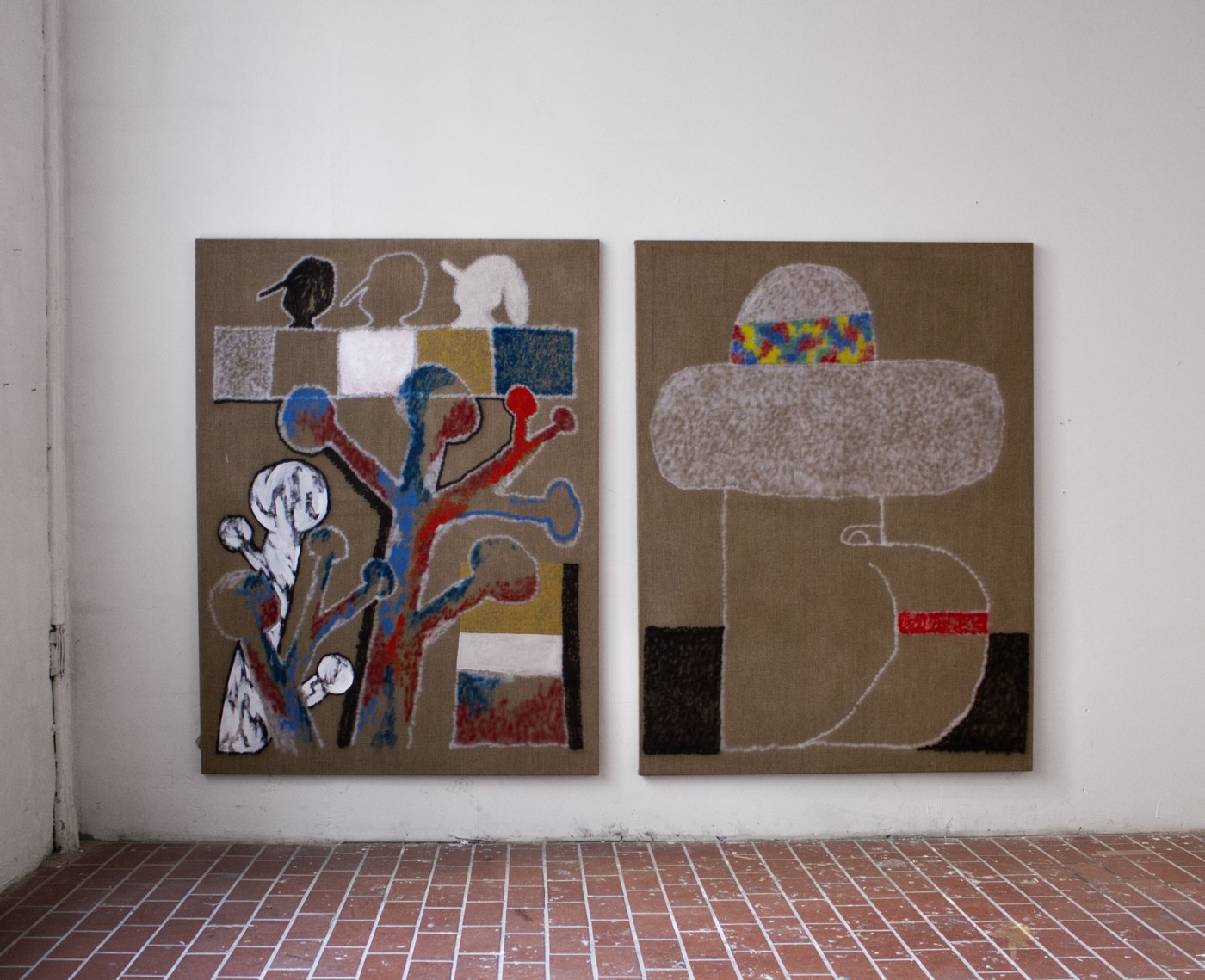 "3 Köpfe" (links), "Egon" (rechts), Airbrush, Acryl- & Kreidefarbe auf Leinen, jeweils 160 x 120 cm, 2020.